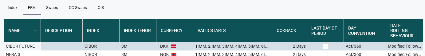 Define all rates and prices imported from market data supplier needed to perform fixing and market valuations. Index, FRA, Swap interests and currency basis spreads. Normally this is already pre-defined for some currencies (the most common) when the system is delivered.