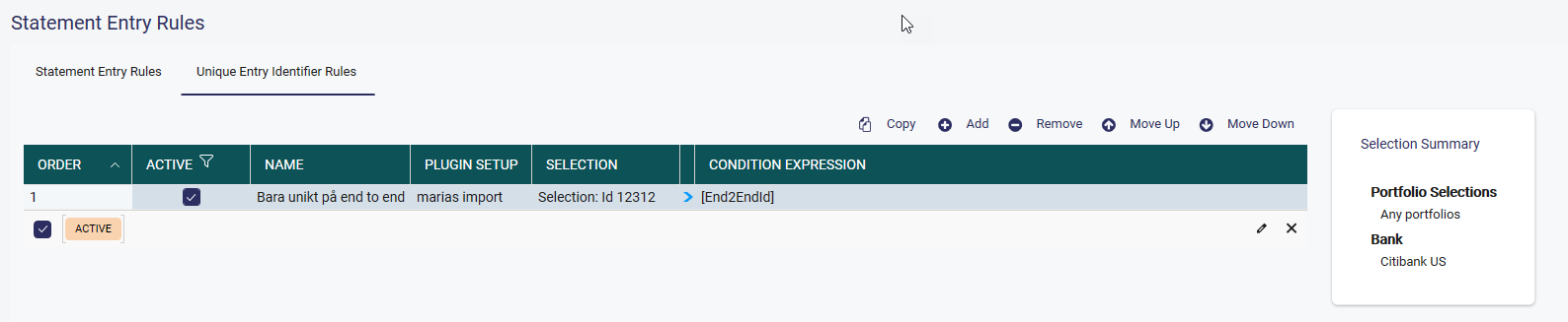 In the picture there is a rule that if the statement comes from Citibank US; Only the three components EndtoEnd ID date and amount combined needs to be unique to get through the duplicate control in the reconciliation.