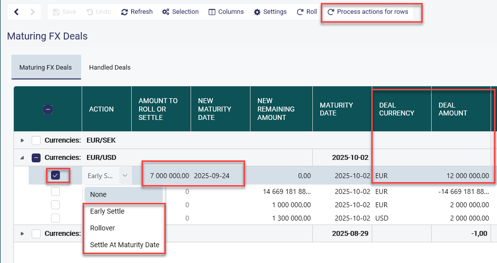 In the Maturing FX Deals ledger all maturing FX deals will be shown. There is a possibility to rollover and settle the deals from the ledger. If hedge accounting is applied there is a functionality to roll over FX deals and keep the original hedging rates through out the chain of FX deals.