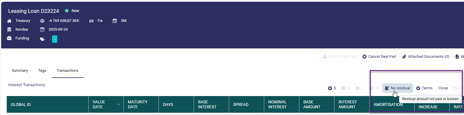 Click on the No residual button. TS will then remove the cash flow and accounting linked to the residual amount.