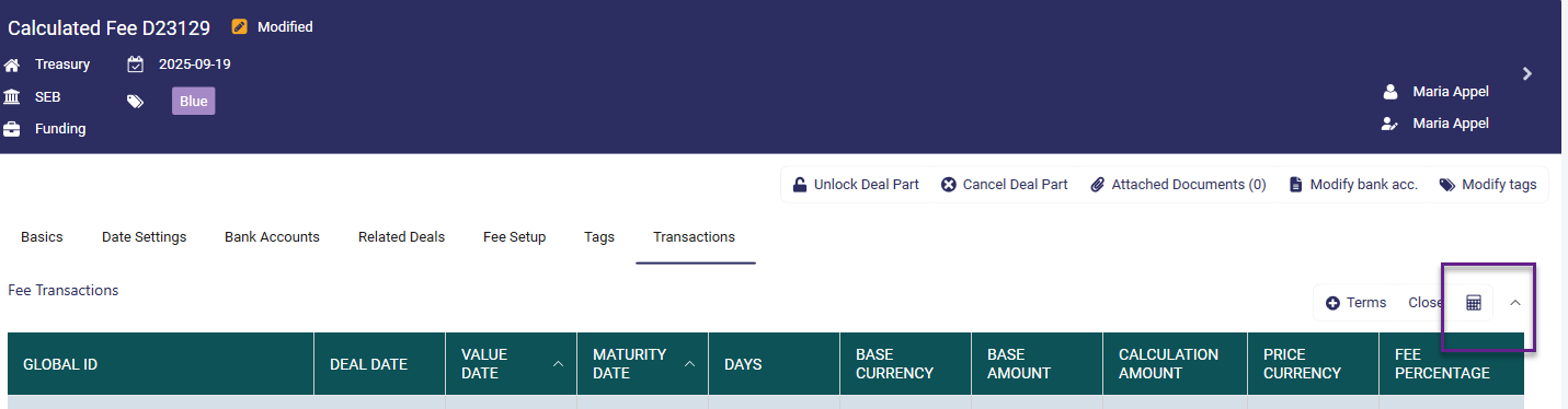 Fees linked to the lease loan that are calculated on the total repayment must be updated by pressing the recalculate button in the transaction view.
