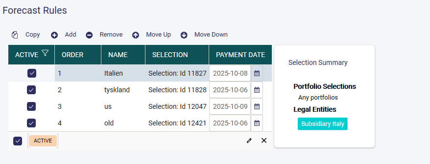 Select the subsidiaries and write Wednesday in the Payment date column. This means that regardless of which payment date the imported forecast transactions have in the file each individual payment date will be set to its closest Wednesday.