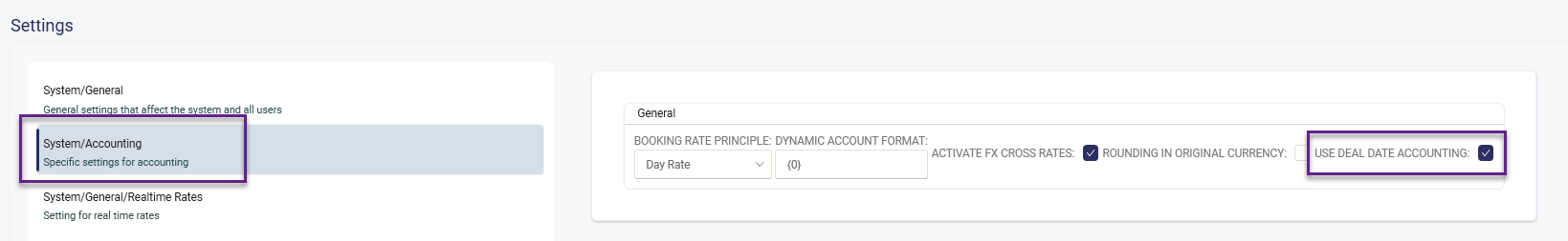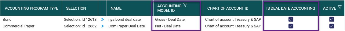 2. In Accounting Rules select relevant Accounting model ID to get the relevant amount types and check the Is deal date accounting box.