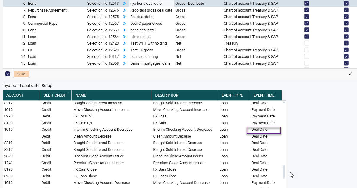 When using the Deal Date accounting model there will some different Accounting Amount Types. The event time Deal date will be shown.