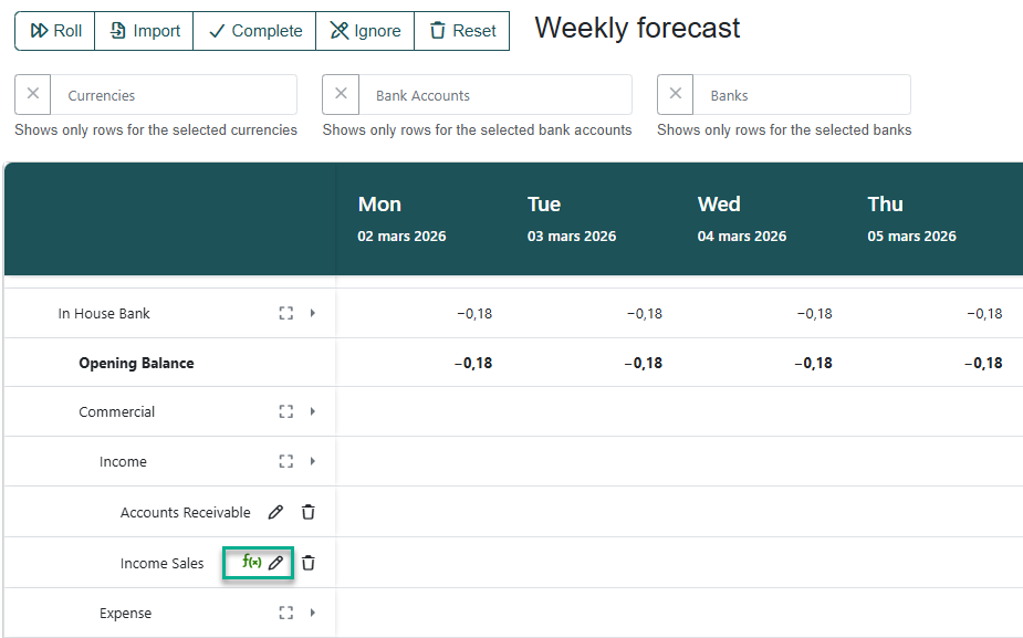 First extract the actual from e.g. the bank account booking for this cash flow type in your ERP. See article Import forecast Import of Forecast Transactions tick the setting Actual when importing the forecast. It is also possible to schedule the import via Autopilot.