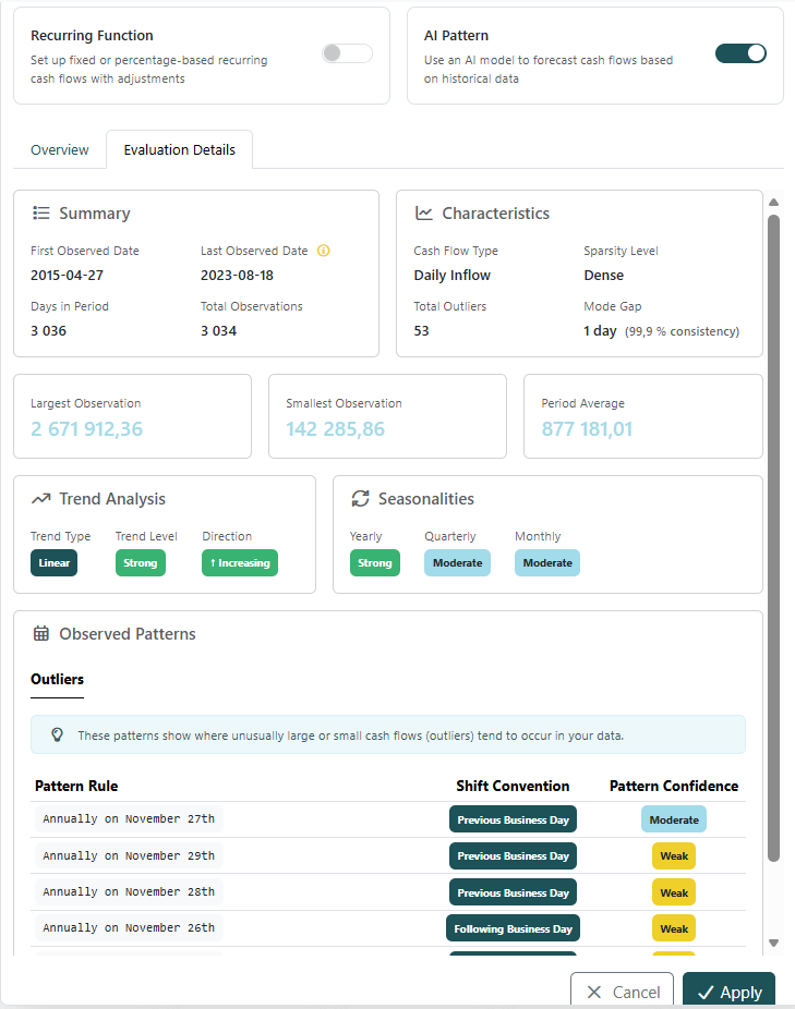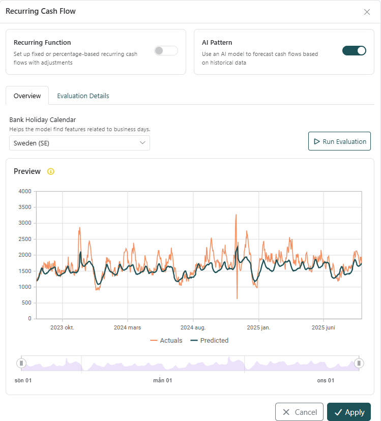 If there is a seasonal or historical pattern in the cash flow, it is possible to upload the actual for a specific cash flow type, e.g. Income Sales, Rent or Salaries and let TS AI predict future cash flow.