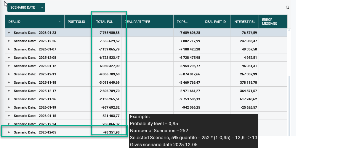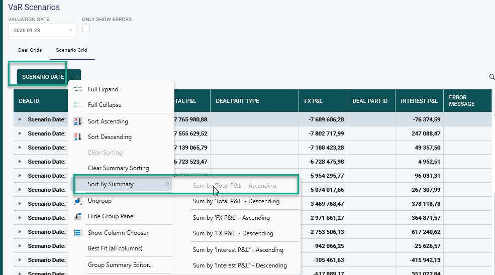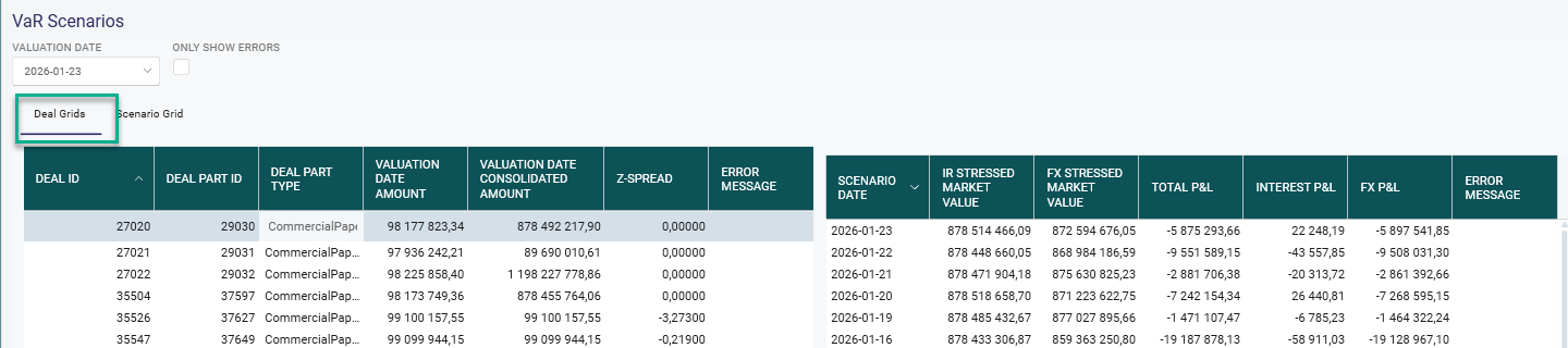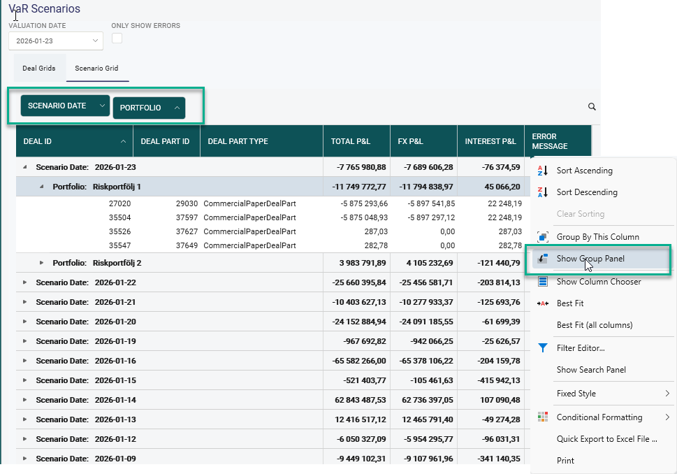 Tab Scenario Grid - Shows all Scenarios. Possible to group by Scenario date, Portfolio, Deal Part type and Deal part ID
