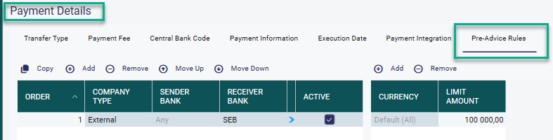 Payments - Payment Details - Tab Pre-Advice Rules