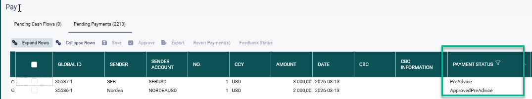 The result of payments and preadvice are seen in the Pending Payments tab.